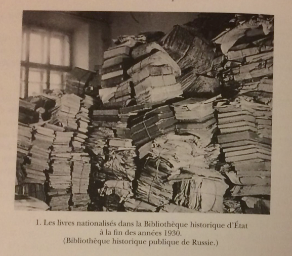 Dès 1920, dans la tourmente révolutionnaire, les bibliothèques impériales furent regroupées. Et toutes les bibliothèques privées de plus de 500 livres, furent confisquées et regroupées au sein de gigantesques entrepôts. On hésita alors entre les brûler ou les vendre (véridique! voir l’article de M. Afanassiev).